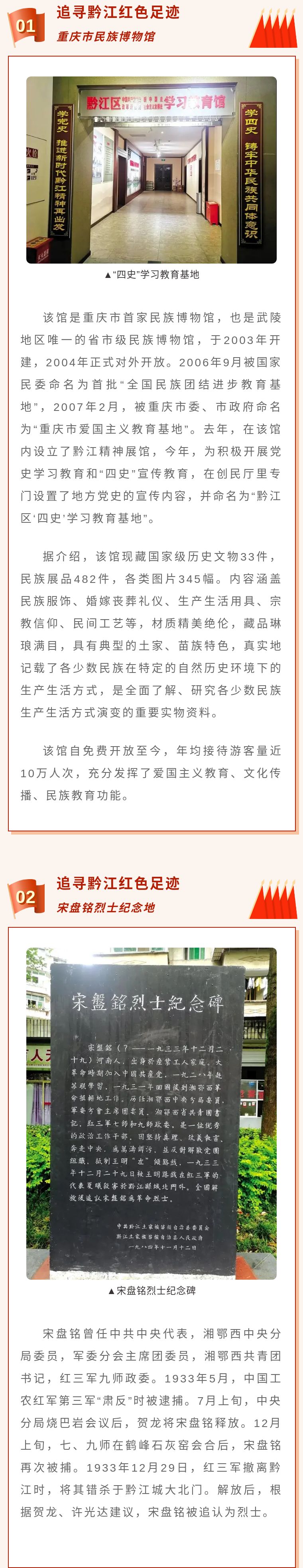 第一條線路:重慶市民族博物館(城西街道新華大道西段512號)、宋盤銘烈士紀(jì)念地(城西街道河濱公園商務(wù)委后門處)、紅軍廣場(城東街道石城社區(qū)小廣場)、三元宮紅軍革命紀(jì)念地和烈士陵園(城東街道下壩社區(qū)三元宮路609號)。